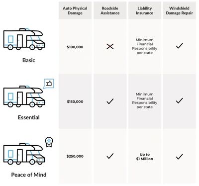 We get that renting an RV can be both an exciting and scary decision — that’s why we go above and beyond to give you maximum peace of mind when you book an RV. We offer three levels of Insurance - Basic, Essential and Peace of Mind. Details can be found on the image to the left for each package.
